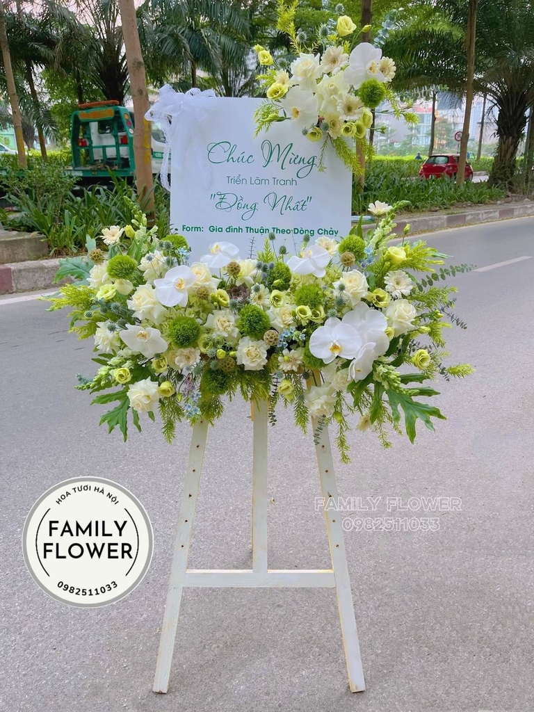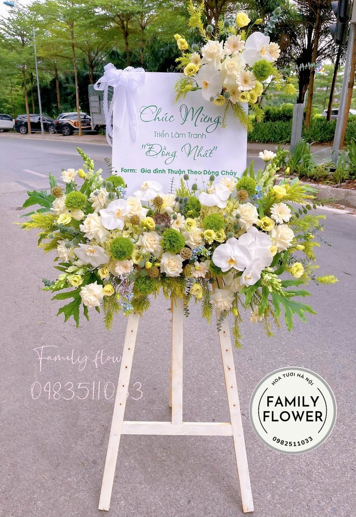 Hoa tươi Hoàn Kiếm ! Khung tranh tone xanh trắng chúc mừng triển lãm ở Hà Nội