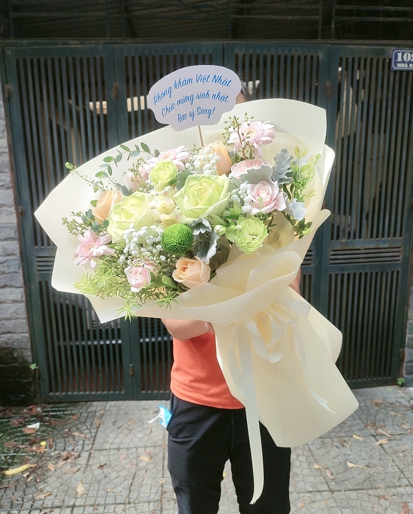 Bó hoa tone xanh nhạt tặng chúc mừng FAMILY FLOWER