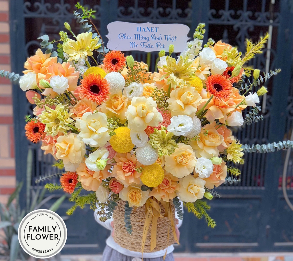 Mẫu lẵng hoa sinh nhật được thiết kế bởi Hoa tươi Hà Nội với gam màu vàng – cam – trắng tinh tế là lựa chọn lý tưởng để gửi tặng sếp, đối tác hoặc khách hàng quan trọng. Hoa sinh nhật Hoàn Kiếm là sự kết hợp của hoa hồng cao cấp, đồng tiền rực rỡ, cúc mẫu đơn và cát tường tạo nên vẻ đẹp hiện đại, thanh lịch nhưng vẫn đầy ấm áp.