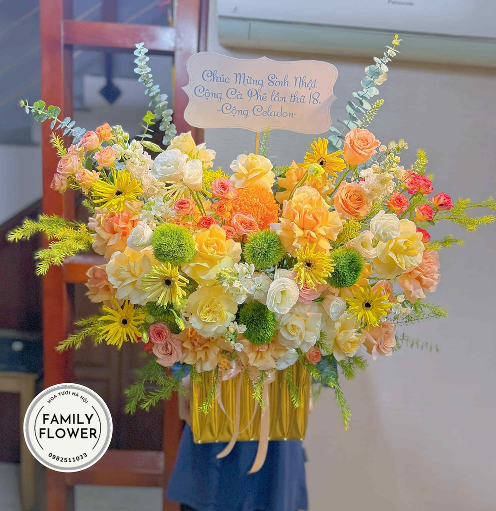 Hoa sinh nhật Tây Hồ lựa chọn tone màu chủ đạo là vàng – cam – trắng – xanh lá, lẵng hoa chúc mừng tượng trưng cho sự phát triển, thịnh vượng và khởi đầu tươi mới.