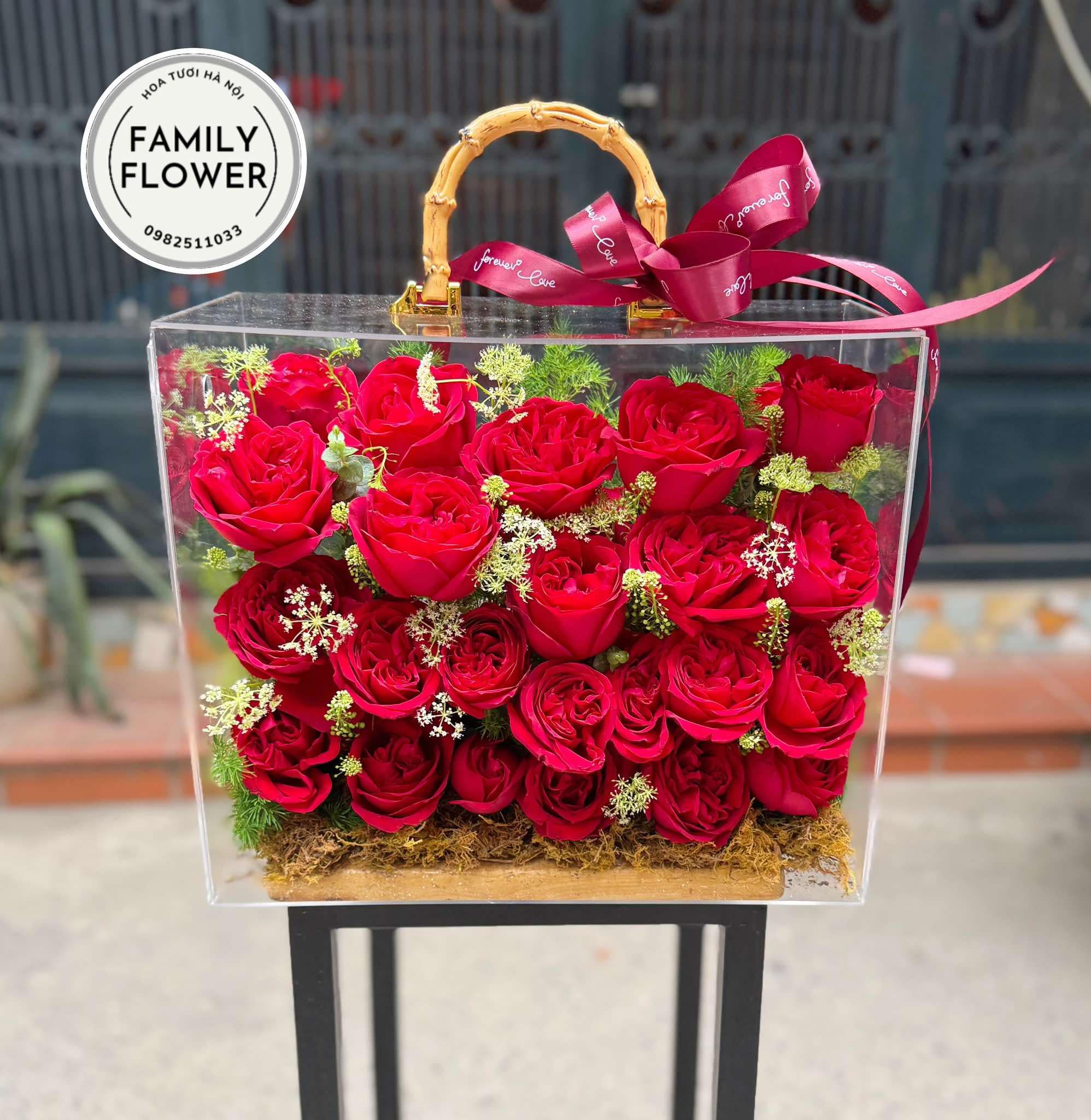 Mẫu vali hoa hồng đỏ là một trong những mẫu hoa chúc mừng cao cấp tại Tiệm hoa Family Flower. Mẫu hoa được tạo nên từ những bông hoa hồng Oharra nhập khẩu cao cấp. Hộp hoa với chất liệu mica cứng cáp được tạp hình giống như một chiếc vali trong suốt kết hợp cùng phụ kiện mang màu bạc sang chảnh. Mẫu hoa là một món quà hoàn hảo để tặng bạn gái nhân các dịp đặc biệt như: sinh nhật, kỷ niệm ngày yêu, ngày 14/2, ngày 20/10, ngày 8/3,...