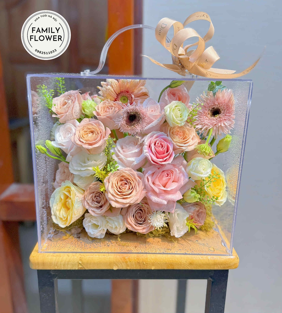 Nhìn thì tưởng là túi xách, hóa ra là một hộp hoa tươi Hà Nội – mà không phải hộp hoa bình thường đâu nhé, đây là cả một khoảng trời pastel dịu dàng được hoa sinh nhật Ba Đình sắp xếp đầy tinh tế. Những bông hồng mềm mại, đủ tone hồng – kem – vàng cứ nhẹ nhàng mà thấm vào mắt, khiến người ta nhìn một lần là chẳng nỡ rời đi.
